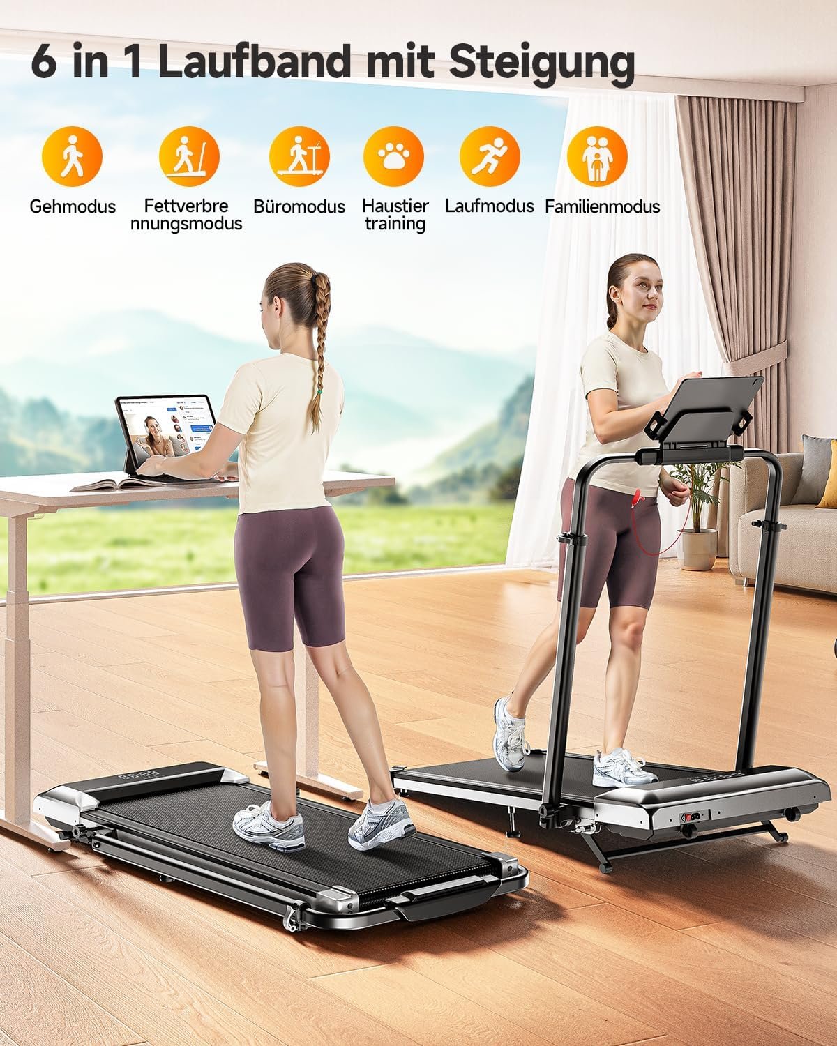 RUNIMON 6-in-1 Laufband | 12% Steigung, 12 km/h, 2,5 PS leiser Motor, 1150 mm Teleskop-Griff, App-Steuerung & Fernbedienung, klappbar
