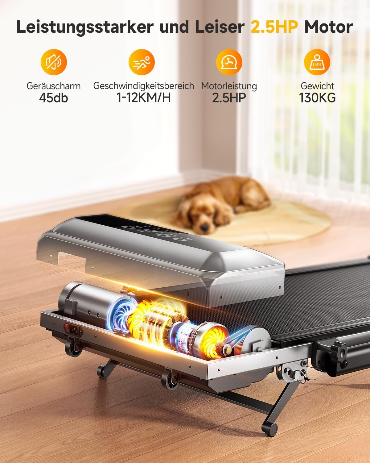 • Leiser 2,5-PS-Motor: Der kraftvolle Antrieb ermöglicht Geschwindigkeiten von 1 bis 12 km/h und trägt Nutzer bis zu 130 kg. Dabei arbeitet der Motor flüsterleise, sodass Sie beim Training problemlos fernsehen oder telefonieren können.