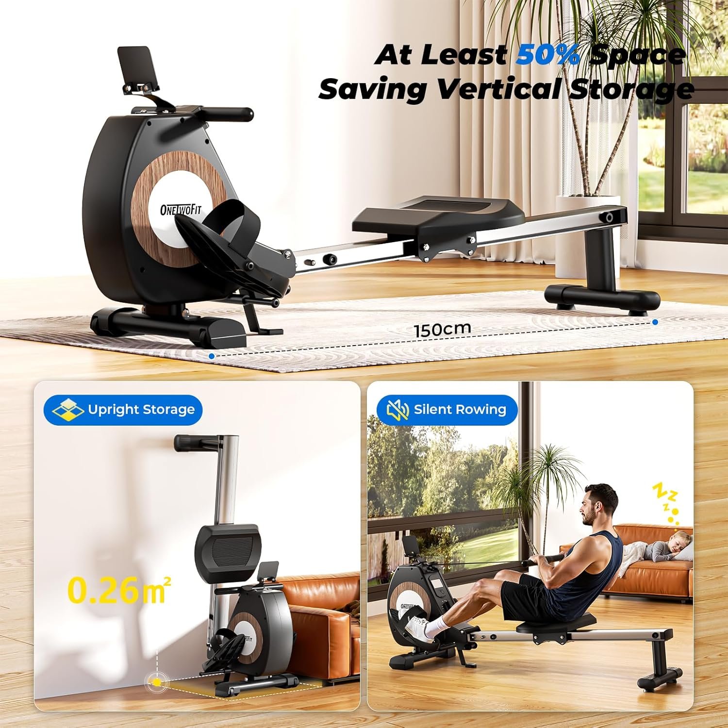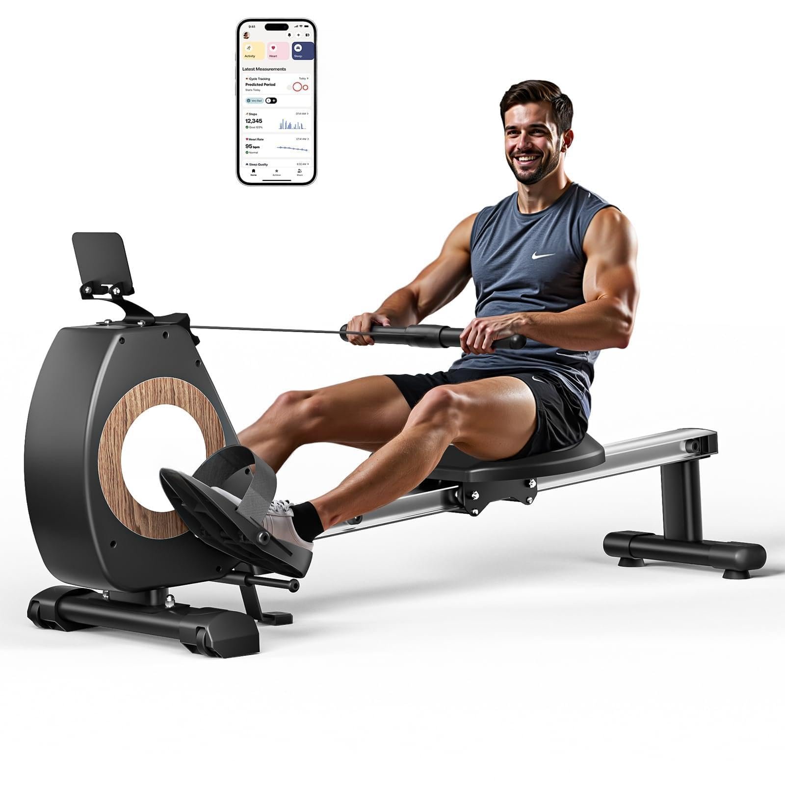 ONETWOFIT Rudergerät Pro | Klappbar, 16 Stufen stiller Widerstand, 160 kg Tragkraft, App-kompatibel & Crosstrainer-Funktion