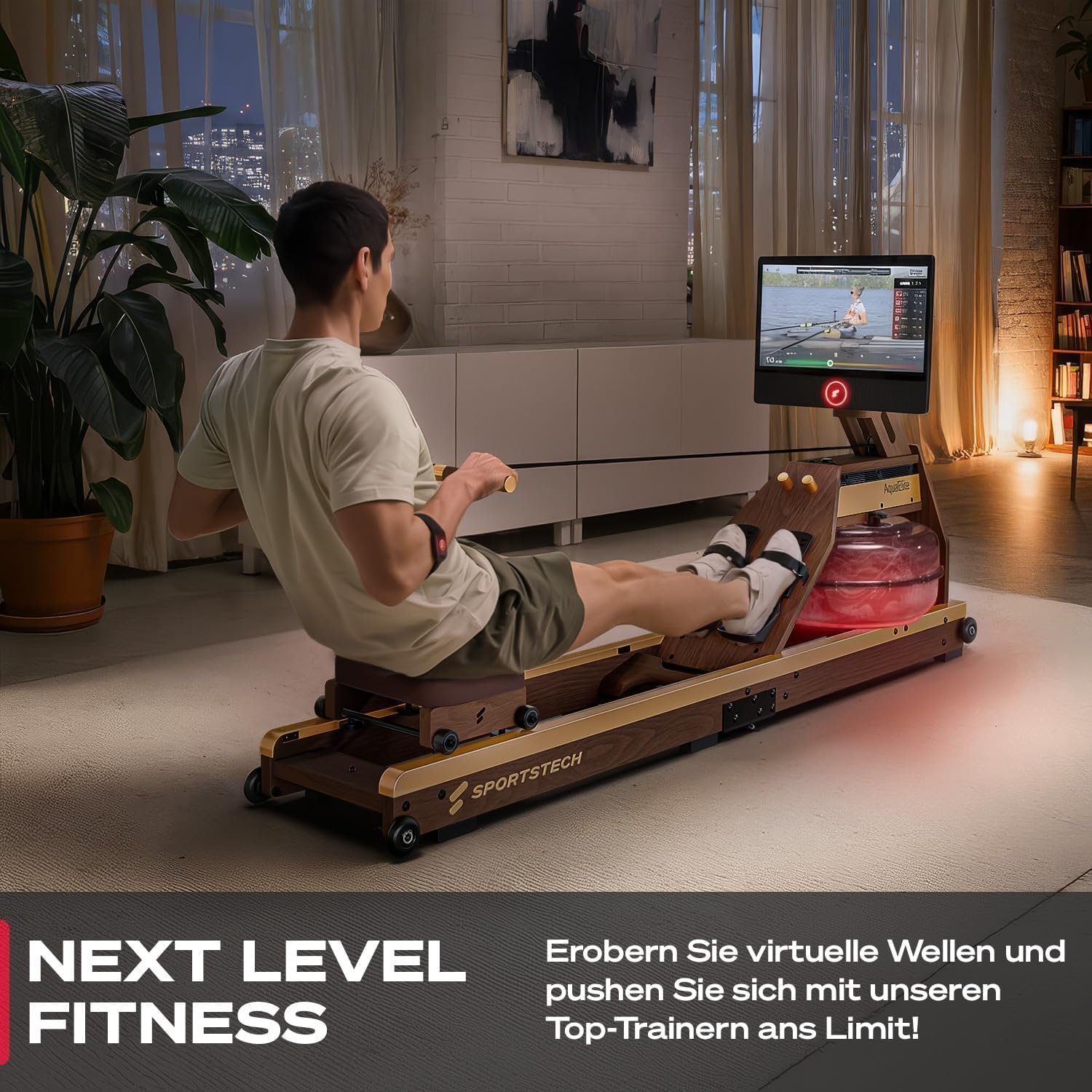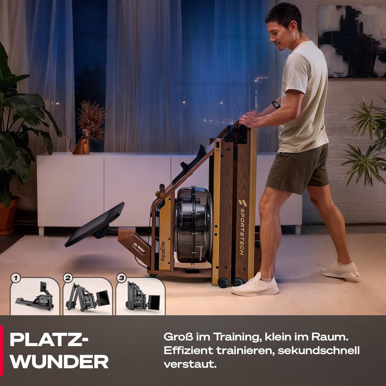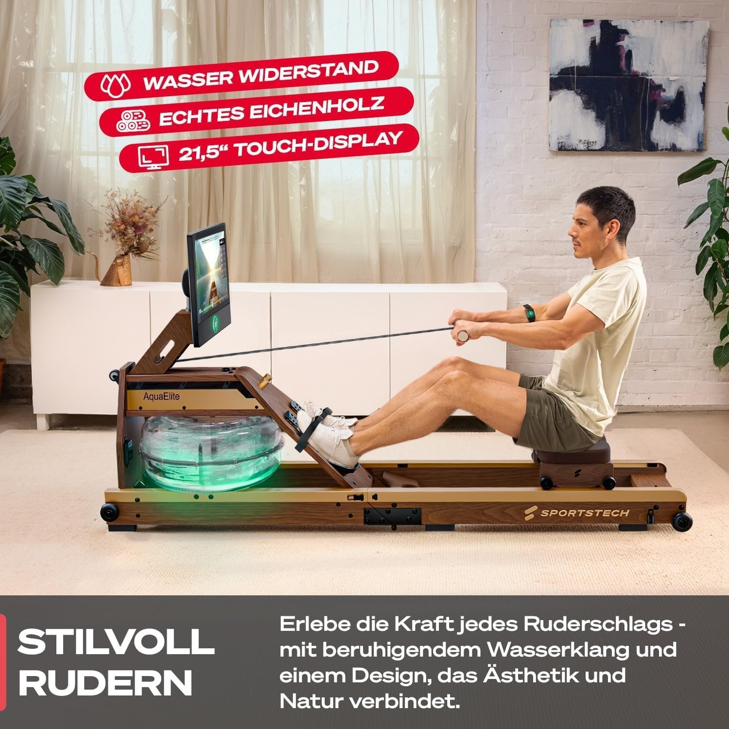 Sportstech AquaElite Wasser-Rudergerät | FSC-Eichenholz, klappbar, LED-Wassertank, 360°-Display & App