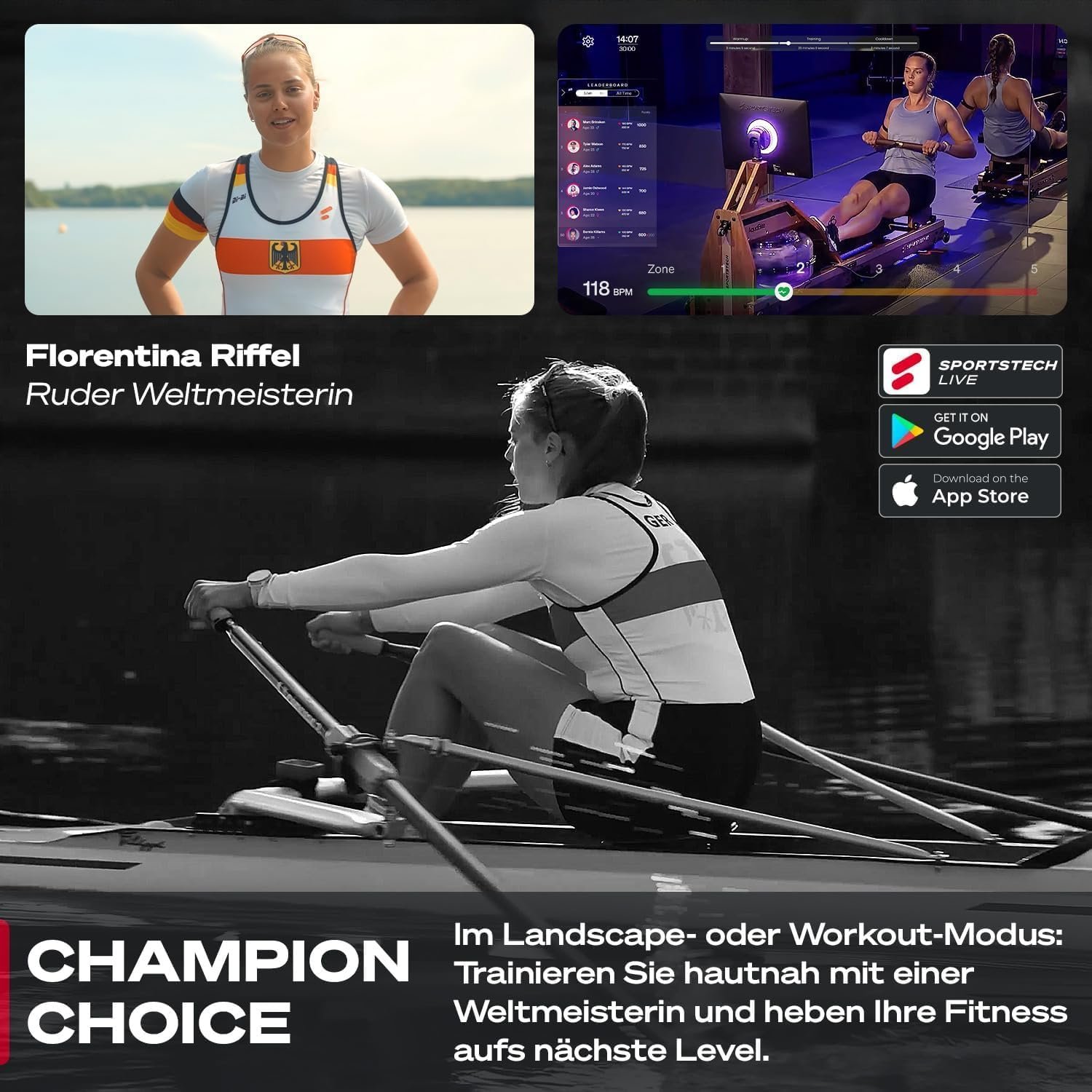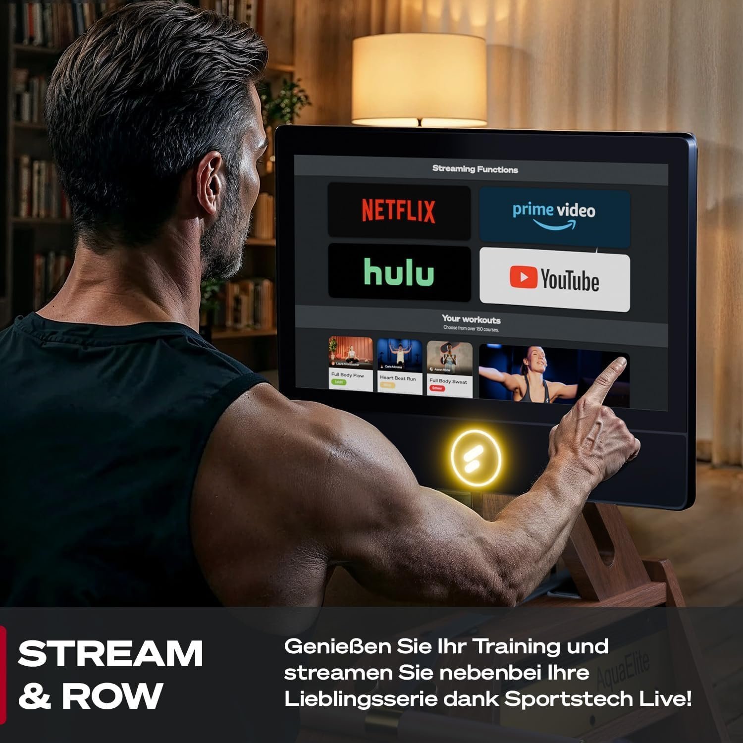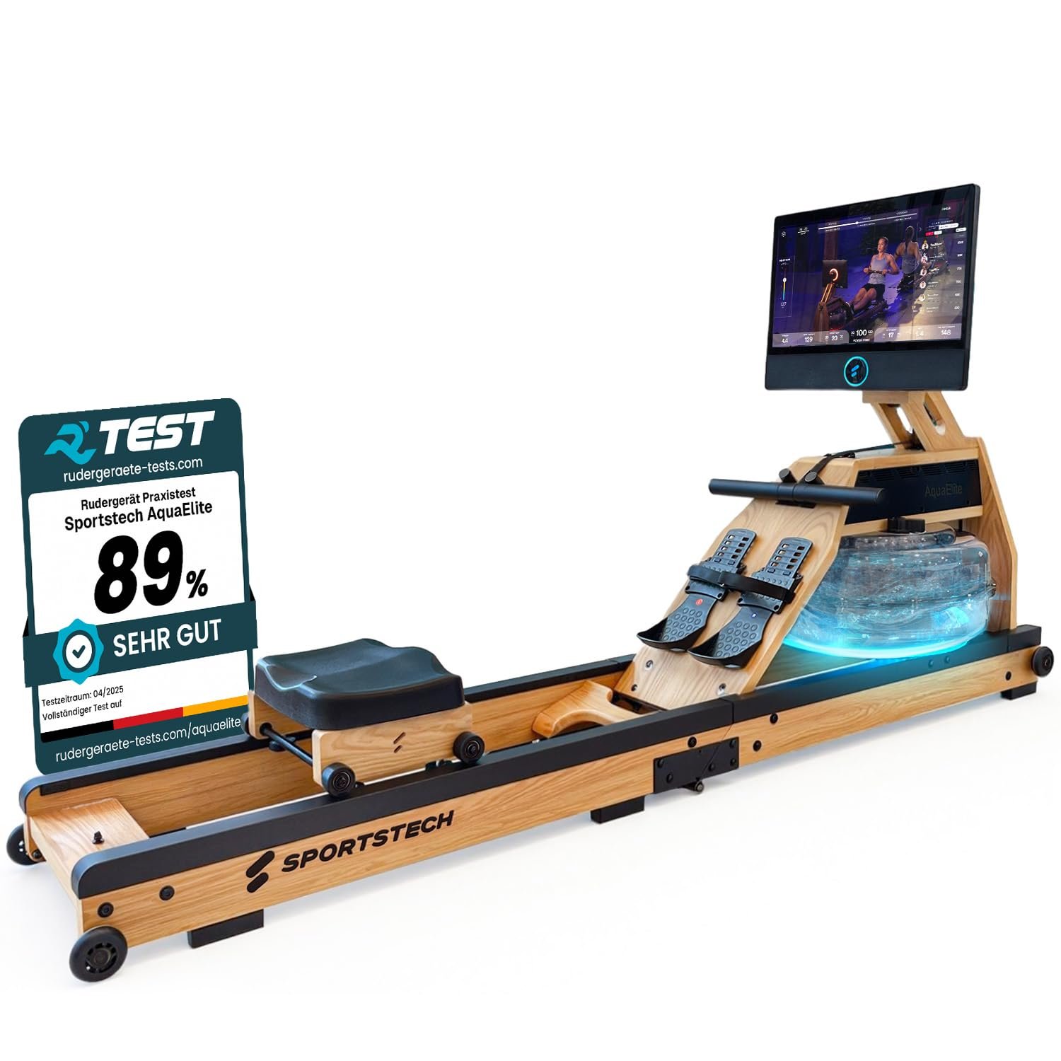 Sportstech AquaElite Wasser-Rudergerät | FSC-Eichenholz, klappbar, LED-Wassertank, 360°-Display & App
