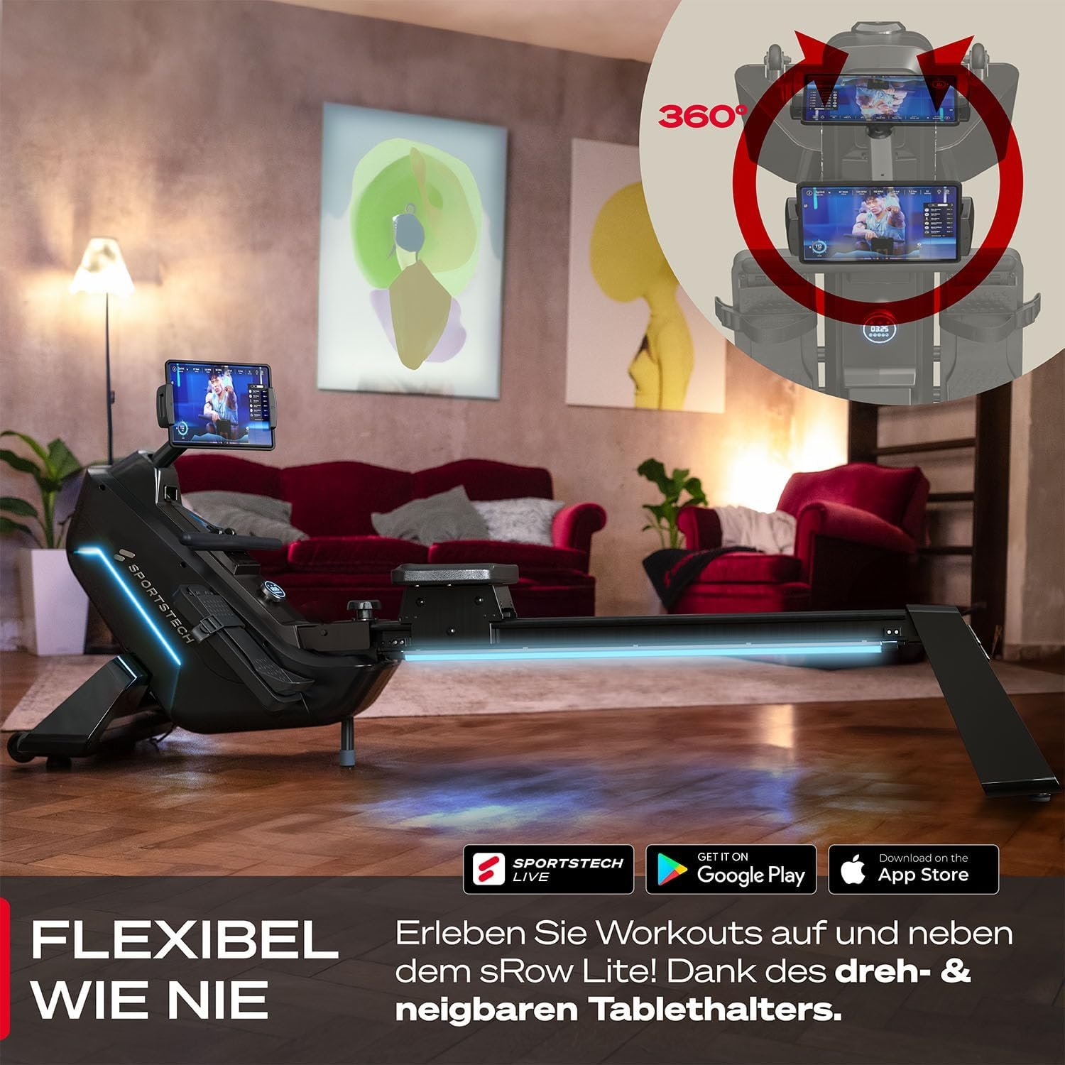 • Smart Trainieren mit App-Anbindung: Verbinden Sie das Rudergerät per Bluetooth mit der Sportstech Live App. Die integrierte, um 360° drehbare Tablet-Halterung hält Ihr Smart-Device sicher an Ort und Stelle. Nutzen Sie interaktive Workouts, Landscape-Videos und Community-Challenges. Praktisch: Drehen Sie das Tablet einfach zur Seite, um im Anschluss Kraft- oder Stretching-Einheiten auf der Matte zu absolvieren.