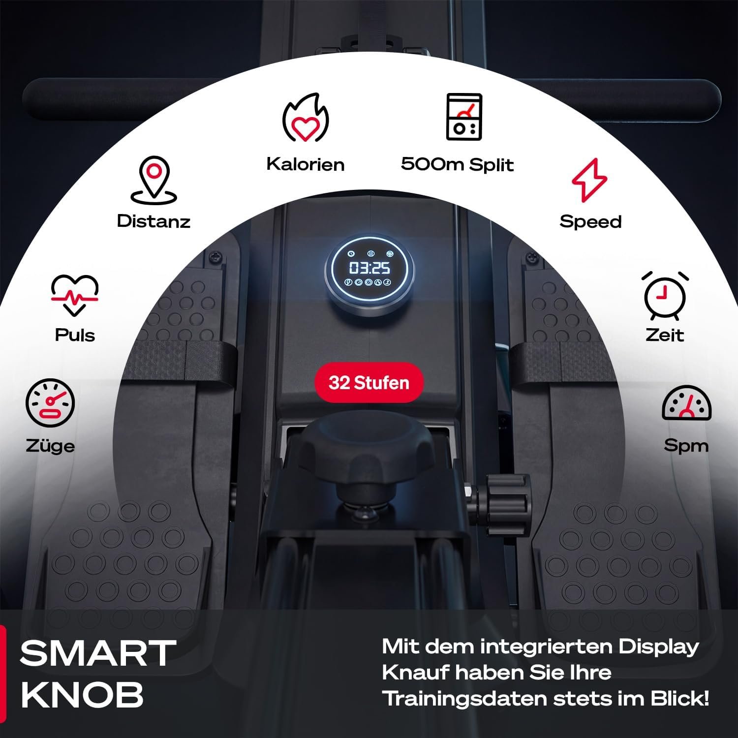 • Intuitives LED-Knob-Display: Steuern Sie Ihr Workout präzise über den zentralen LED-Knob. Sie erfassen alle wichtigen Echtzeit-Daten wie Widerstandsstufe, Zeit, Distanz, Geschwindigkeit, Kalorienverbrauch und Leistung (in Watt) auf einen einzigen Blick und können Werte im Handumdrehen anpassen.