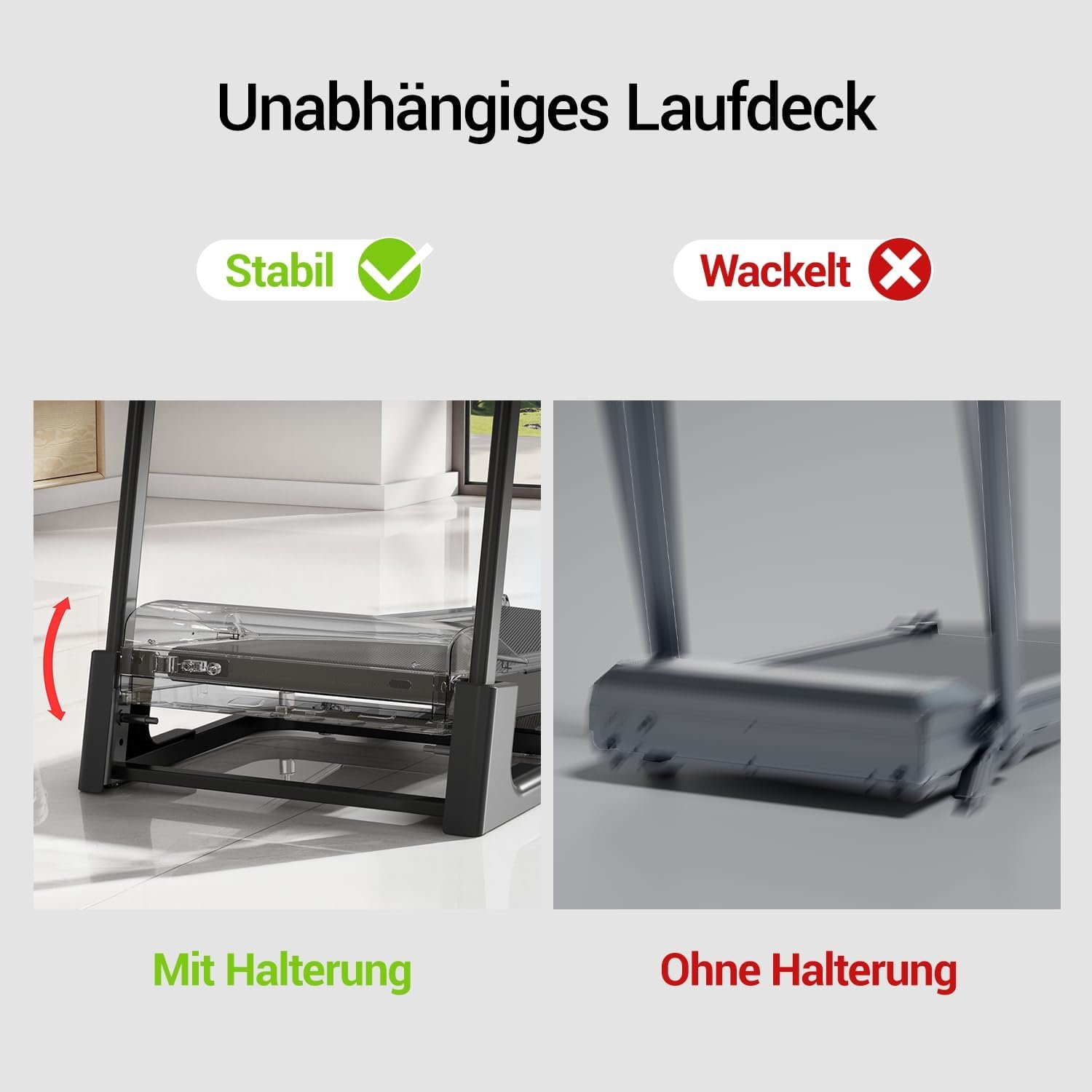 Soft-Drop Hydrauliksystem: Dank des hydraulischen Klappmechanismus lässt sich das Laufband sicher und mühelos ausklappen. Die Basis senkt sich sanft ab, was sowohl den Boden als auch das Gerät schützt.